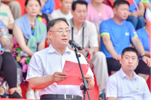 比賽間隙,組織了快閃活動(dòng),巨幅黨旗從主看臺(tái)鋪開(kāi),與會(huì)領(lǐng)導(dǎo)和全場(chǎng)高聲同唱《沒(méi)有共產(chǎn)黨就沒(méi)有新中國(guó)》,現(xiàn)場(chǎng)氣氛到達(dá)頂點(diǎn)。